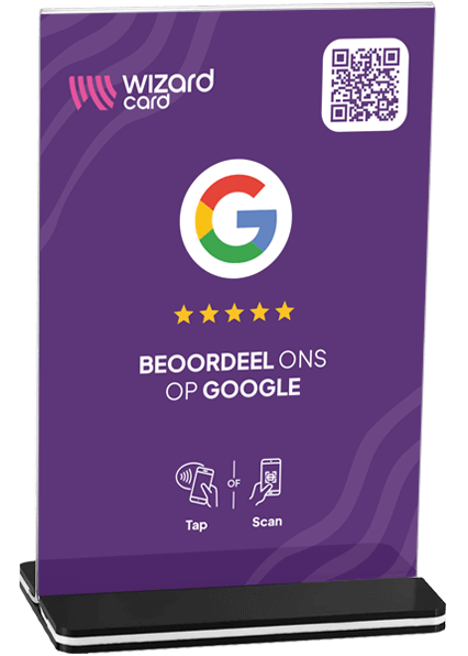 Een Google Review display is een innovatief hulpmiddel dat gebruik maakt van NFC-technologie en vaak ook een QR-code. Het innovatieve NFC beoordelingsdisplay is ontworpen om klanten gemakkelijk naar jouw Google Recensie-pagina te leiden. Door simpelweg hun smartphone bij het display te houden, worden klanten direct doorgestuurd naar de juiste pagina, waardoor het voor hen eenvoudig is om snel een review achter te laten. Dit maakt het verzamelen van Google reviews sneller en gemakkelijker, wat bijdraagt aan de online reputatie van je bedrijf.