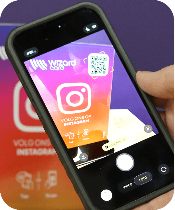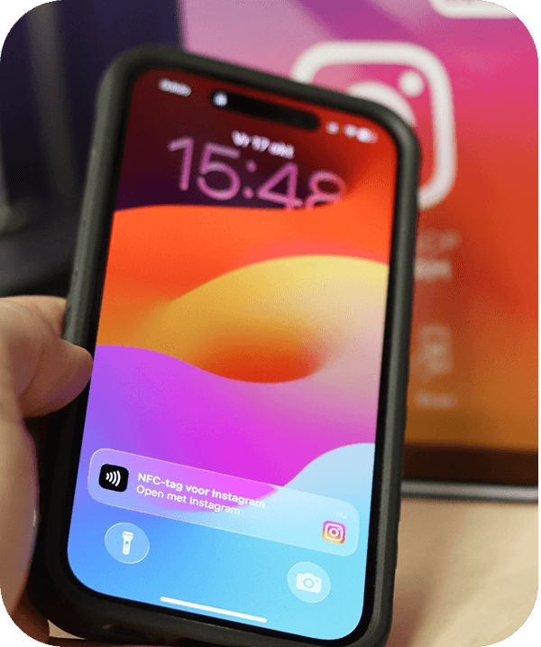 Naast een QR-code bevatten onze displays ook een NFC-chip. Dit betekent dat klanten eenvoudig hun smartphone tegen het display kunnen houden om direct naar jouw Instagram-pagina te gaan. Voor oudere toestellen voorzien wij de displays ook van een QR-code. Deze dubbele functionaliteit maakt het voor al je klanten gemakkelijk om je te volgen.