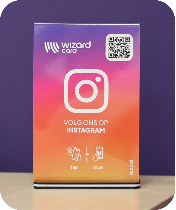 De display bevat een NFC-chip en een QR-code. Klanten hoeven hun telefoon alleen kort tegen de display te houden of de QR-code te scannen en komen direct op jouw Instagram-profiel terecht.